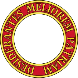 | Ribbon | The ribbon (also called a circlet) is marked desiderantes meliorem patriam, meaning "desiring a better country", which is the motto of the Order of Canada, taken from Hebrews 11:16. This component was added by the Queen in 1987 on the advice of Prime Minister Brian Mulroney.[4] With the patriation of oversight of arms to Canada through the Canadian Heraldic Authority the following year,[74] the constitution of the Order of Canada was amended to include entitlement by all recipients to encircle their own arms with the ribbon if arms are granted to them.[75] Since 1994 the arms used by government ministers and institutions have slowly changed to reflect the new version with the ribbon.[17] | ![]() |
