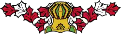 | Helm | The arms show a royal helmet, which is a barred helm of gold embossed with a maple leaf design looking outward, with mantling of white and red, stylized in the official version to look like maple leaves.[69] | |