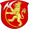 ShieldGules, a lion rampant Or, crowned and bearing an axe Or with blade Argent