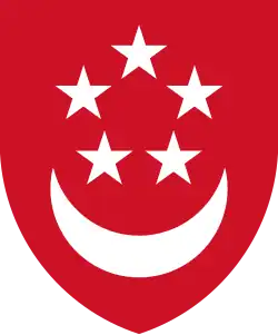 The central emblem of the coat of arms is a red shield with five white stars resting above a white crescent, similar to the crescent and stars used on the Singapore flag and such other national symbols as the national ensign for civilian ships. Red symbolises "universal brotherhood and equality of man" and white "pervading and everlasting purity and virtue". The crescent represents a new moon, which reflects "a young nation on the ascendant", while the five-pointed stars "stand for the nation's ideals of democracy, peace, progress, justice and equality".[5] The same emblem appears in the top corner of the flag of Singapore.