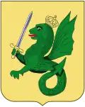 | Shield | Paleways of two pieces, azure and gules; a chief argent studded with three mullets equidistant from each other; and, in point of honor, ovoid argent over all the sun rayonnant with eight minor and lesser rays |