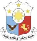 Pale ways of two pieces, azure and gules; a chief argent studded with three golden stars equidistant from each other; in point of honor, ovoid argent over all the sun rayonnant with eight minor and lesser rays; in sinister base gules, the Lion Rampant of Spain; in dexter base azure, the American eagle displayed proper. Beneath, a scroll with the words 'Republic of the Philippines' inscribed thereon.