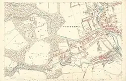 The topography of Coatbridge was an important feature in the town's development during the Industrial Revolution. Coatbridge rests 60 metres below the "Slamannan plateau" and neighbouring Airdrie sits on its edge. The low-lying flat ground of Coatbridge was a vital factor in the siting of the town's blast furnaces and the Monkland Canal route. Although Airdrie was an already established town and had local supplies of ironstone, the Monkland Canal link did not extend into Airdrie because of its higher elevation.[39] The Clyde Valley plan of 1949 described Coatbridge as 'situated over a flooded coalfield'.[40] Tenement buildings in Coatbridge were not built to the same level as Glasgow tenements due to danger of local subsidence from centuries of local mining.[41]