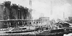 For a fortunate few though, fortunes could be won "with a rapidity only equalled by the princely gains of some of the adventurers who accompanied Pizarro to Peru", noted one observer.[18] Among the most notable success stories were the six sons of Coatbridge farmer Alexander Baird. The Baird family had become involved in coal mining but opened an iron foundry in order to exploit the new hot blast process of iron smelting invented by James Beaumont Neilson. The Bairds subsequently constructed numerous iron foundries in Coatbridge including the famous Gartsherrie iron works.[28] The waste heap or 'bing' from the Baird's Gartsherrie works was said to be as large as the great pyramid in Egypt. One son, James Baird, was responsible for erecting 16 blast-furnaces in Coatbridge between 1830 and 1842.[29] Each of the six sons of Alexander Baird was reputed to have become a millionaire.[18]