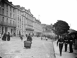 The wars against the French led to the town, then usually known as Ballyvoloon or The Cove of Cork, being developed as a British naval port assigned an admiral. Many of the present-day buildings date from this time of build-up. George Brodrick, 5th Viscount Midleton engaged the English architect Decimus Burton to improve the streetscape and buildings during the 1840s.[11][12] The eventual cessation of hostilities dented Cobh's prosperity for a while, but it soon became known as a health resort; many patients stayed here for their health because of the temperate climate. Amongst their number was Charles Wolfe, who wrote "The Burial of Sir John Moore After Corunna". Wolfe's body is buried in the Old Church Cemetery outside the town.