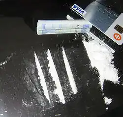 Most banknotes have traces of cocaine on them; this has been confirmed by studies done in several countries.[84] In 1994, the US 9th Circuit Court of Appeals cited findings that in Los Angeles, three out of four banknotes were tainted by cocaine or another illicit drug.[85][86]