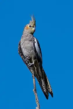 The cockatiel's distinctive crest expresses the animal's emotional state. The crest is dramatically vertical when the cockatiel is startled or excited, gently oblique in its neutral or relaxed state, and flattened close to the head when the animal is angry or defensive. The crest is also held flat but protrudes outward in the back when the cockatiel is trying to appear alluring or flirtatious. When the cockatiel is tired, the crest is seen positioned halfway upwards, with the tip of the crest usually curling upward.[18] In contrast to most cockatoos, the cockatiel has long tail feathers roughly making up half of its total length. At 30 to 33 cm (12 to 13 in), the cockatiel is the smallest of the cockatoos, which are generally larger at between 30 and 60 cm (12 and 24 in).