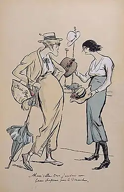 Chanel had begun designing hats while living with Balsan, initially as a diversion that evolved into a commercial enterprise. She became a licensed milliner in 1910 and opened a boutique at 21 rue Cambon, Paris, named Chanel Modes.[29] As this location already housed an established clothing business, Chanel sold only her millinery creations at this address. Chanel's millinery career bloomed once theatre actress Gabrielle Dorziat wore her hats in Fernand Nozière's play Bel Ami in 1912. Subsequently, Dorziat modelled Chanel's hats again in photographs published in Les Modes.[29]