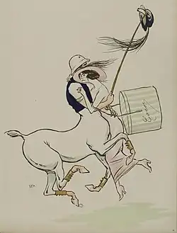 Having learned to sew during her six years at Aubazine, Chanel found employment as a seamstress.[17] When not sewing, she sang in a cabaret frequented by cavalry officers. Chanel made her stage debut singing at a cafe-concert (a popular entertainment venue of the era) in a Moulins pavilion, La Rotonde. She was a poseuse, a performer who entertained the crowd between star turns. The money earned was what they managed to accumulate when the plate was passed. It was at this time that Gabrielle acquired the name "Coco" when she spent her nights singing in the cabaret, often the song, "Who Has Seen Coco?" She often liked to say the nickname was given to her by her father.[18] Others believe "Coco" came from Ko Ko Ri Ko, and Qui qu'a vu Coco, or it was an allusion to the French word for kept woman, cocotte.[19] As an entertainer, Chanel radiated a juvenile allure that tantalised the military habitués of the cabaret.[5]