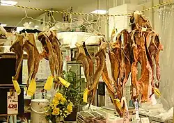Cod has been an important economic commodity in international markets since the Viking period (around 800 AD). Norwegians travelled with dried cod and soon a dried cod market developed in southern Europe. This market has lasted for more than 1,000 years, enduring the Black Death, wars and other crises, and is still an important Norwegian fish trade.[62] The Portuguese began fishing cod in the 15th century. Clipfish is widely enjoyed in Portugal. The Basques played an important role in the cod trade, and allegedly found the Canadian fishing banks before Columbus' discovery of America.[63] The North American east coast developed in part due to the vast cod stocks. Many cities in the New England area are located near cod fishing grounds. The fish was so important to the history and development of Massachusetts, the state's House of Representatives hung a wood carving of a codfish, known as the Sacred Cod of Massachusetts, in its chambers.