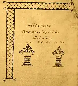 A 17th-century Latin note on a flyleaf (from the binding in a royal library) states the codex was given to a patriarchate of Alexandria in 1098 (donum dedit cubicuo Patriarchali anno 814 Martyrum), although this may well be "merely an inaccurate attempt at deciphering the Arabic note by Athanasius" (possibly the patriarch Athanasius III).[37] The authority for this statement is unknown.[20]