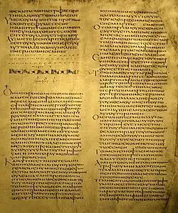 The majuscule letters have elegant shape, but a little less simple than those in Codex Sinaiticus and Codex Vaticanus.[6]: 52  At the end of a line, these letters are often very small, and much of the writing is very pale and faint.[11][18] Punctuation is more frequent, usually on a level with the top of the preceding letter, while a vacant space, proportionate to the break in the sense, follows the end of a paragraph.[6]: 52  At the end of each book the colophon is ornamented by pretty volutes from the initial copyist.[6]: 52  The Ammonian Sections with references to the Eusebian Canons (an early system of dividing the four Gospels into different sections, developed by early church writer Eusebius of Caesarea) stand in the margin of the Gospels.[10][6]: 53 [11] It contains divisions into larger sections (known as κεφάλαια (kephalaia), or chapters), the headings of these sections (known as τίτλοι / titloi) stand at the top of the pages.[6]: 53-54  The places at which sections start are indicated throughout the Gospels, and in Luke and John their numbers are placed in the margin of each column. To all the Gospels (except Matthew, due to several pages missing at the beginning) is prefixed by a table of contents (also known as κεφάλαια).[19]