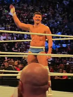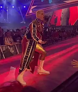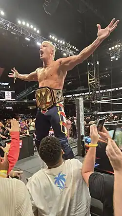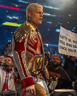 The son of Dusty Rhodes and half-brother of Dustin Rhodes, Rhodes won two Georgia state high-school championships as an amateur wrestler in 2003 and 2004. He signed with WWE in 2006 and featured for its developmental territory, Ohio Valley Wrestling (OVW), where he won the OVW Television Championship, OVW Southern Tag Team Championship (with Shawn Spears), and OVW Heavyweight Championship once each, becoming a Triple Crown Champion. Between 2007 and 2016, he won seven world tag team championships with four different partners, as well as the Intercontinental Championship twice.[8] During this time, he adopted various gimmicks, including performing as Stardust, a melodramatic spin-off of his brother's gimmick, Goldust. He departed WWE in 2016 and returned in 2022, and has since won the Royal Rumble match in 2023 and 2024, the inaugural WWE Crown Jewel Championship in 2024, the King of the Ring tournament in 2025, the WWE Championship twice, becoming WWE's 34th Triple Crown Champion, and headlined WWE's flagship event, WrestleMania, four times (39 – Night 2, 40 – Night 1 & 2, and 41 – Night 2).