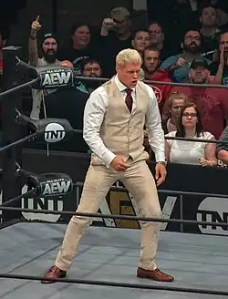 In November 2018, several trademarks were filed in Jacksonville, Florida that indicated the launch of a new wrestling promotion.[219][220][221] On January 1, 2019, All Elite Wrestling (AEW) was unveiled during a conference in Jacksonville, with Cody revealing that he, along with Matt and Nick Jackson of The Young Bucks and Kenny Omega, would serve as Executive Vice Presidents, as well as on-air talent. Both Cody and The Young Bucks signed five-year contracts with the promotion.[222] At their inaugural event on May 25, Double or Nothing, Cody defeated Dustin Rhodes; it would later win "Match of the Year" from Pro Wrestling Illustrated.[223][224] On June 29 at Fyter Fest, Cody wrestled Darby Allin to a time limit draw. After the match, Rhodes was attacked by Shawn Spears and struck with a chair shot that caused Rhodes to bleed heavily from the back of his head.[225] While Rhodes did not suffer a concussion, he did require 12 surgical staples.[226] Spears' actions would be condemned by MJF, Cody's self-proclaimed best friend.[227] MJF would later become Cody's cornerman for his matches.