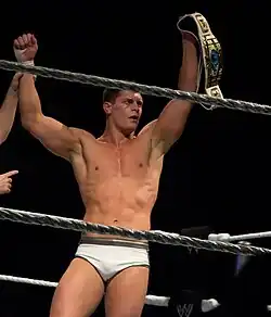 Following the loss at WrestleMania, Rhodes went on a brief losing streak, due to Big Show distracting him during matches.[120] Four weeks after losing the title, Rhodes regained it at Extreme Rules on April 29 by defeating Big Show in a Tables match.[121] On the May 7 episode of Raw SuperShow, Rhodes retained his title against Big Show in a rematch after getting himself counted out.[122] Two weeks later at Over the Limit on May 20, Rhodes lost the Intercontinental Championship to the returning Christian. He would go on to lose to Christian in a rematch for the title at No Way Out on June 17.[123] On the June 29 SmackDown, Rhodes and David Otunga were defeated by Christian and United States Champion Santino Marella in a Money in the Bank qualification match for the World Heavyweight Championship, due to Otunga being pinned.[124] Afterwards, Rhodes claimed that he had not lost and demanded another chance.[124] Four days later on Super SmackDown Live, the WWE Board of Directors granted Rhodes another shot and he defeated Christian to earn a spot in the match.[125] At Money in the Bank on July 15, he was unsuccessful as the match was won by Dolph Ziggler.[126] On September 16 at Night of Champions, Rhodes failed to capture the Intercontinental Championship from The Miz in a fatal-four-way match, also involving Rey Mysterio and Sin Cara.[127]