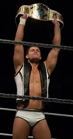 In May 2008, Ted DiBiase began feuding with the duo, threatening to take their titles in his first match as part of the Raw brand.[39] At the pay-per-view event, Night of Champions on June 29, Rhodes turned on Holly by revealing himself as DiBiase's partner to help him win the match and also become a two-time World Tag Team Champion, turning heel in the process.[40][41]
