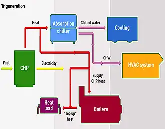 A plant producing electricity, heat and cold is called a trigeneration[28] or polygeneration plant. Cogeneration systems linked to absorption chillers or adsorption chillers use waste heat for refrigeration.[29]