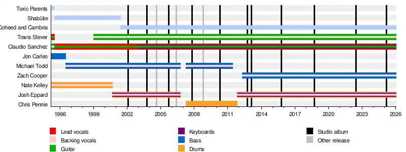 Coheed and Cambria is an American progressive rock band from Nyack, New York, formed in 1995. It consists of Claudio Sanchez (vocals, guitars, keyboards), Travis Stever (guitars, vocals), Josh Eppard (drums, keyboards, backing vocals), and Zach Cooper (bass, backing vocals).[1] The group's music incorporates aspects of progressive rock, pop, heavy metal, and post-hardcore.[2]