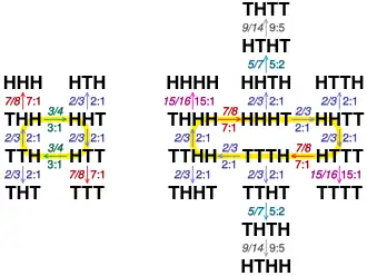 Graphs of best responses for Penney's games of sequence lengths 3 and 4—each sequence is dominated by the sequence pointing to it with the given probability (italics) or odds (normal text)[29]