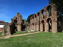 Medieval Colchester's main landmark is Colchester Castle, which is an 11th-century Norman keep and built on top of the vaults of the old Roman temple. There are notable medieval ruins in Colchester, including the surviving gateway of the Benedictine abbey of St John the Baptist (known locally as "St John's Abbey"), and the ruins of the Augustinian priory of St Botolph (known locally as "St Botolph's Priory"). Many of Colchester's parish churches date from this period.