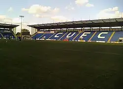 Plans for a new stadium were submitted in April 1999,[50] with planning consent approved in 2003.[51] The Council backed the £14.23 million project by taking out a £10.23 million loan in November 2006,[52] with the remaining £4 million supplied in the form of grants from the Football Foundation and local government and development agencies.[53] Scottish firm Barr Construction were announced as contractors for the stadium,[54] with work beginning in July 2007.[53]