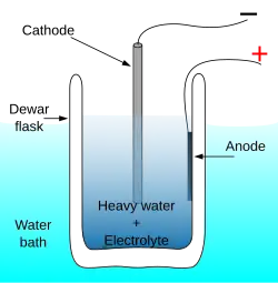 In 1989, two electrochemists at the University of Utah, Martin Fleischmann and Stanley Pons, reported that their apparatus containing heavy water had produced anomalous heat ("excess heat") of a magnitude they asserted would defy explanation except in terms of nuclear processes.[1] They further reported measuring small amounts of nuclear reaction byproducts, including neutrons and tritium, both of which are produced by fusion of deuterium, found in heavy water (see Fusion power § Deuterium).[2] The small tabletop experiment involved electrolysis of heavy water on the surface of a palladium (Pd) electrode.[3] The reported results received wide media attention[3] and raised hopes of a cheap and abundant source of energy.[4] Both neutrons and tritium are found in trace amounts from natural sources. These traces are produced by cosmic ray interactions and nuclear radioactive decays occurring in the atmosphere and the earth.