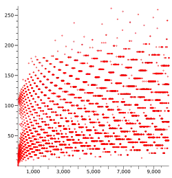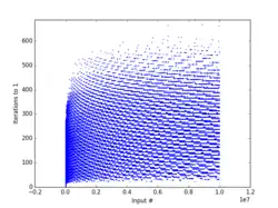 The x axis represents starting number, the y axis represents the highest number reached during the chain to 1. This plot shows a restricted y axis: some x values produce intermediates as high as 2.7×107 (for x = 9663) -
