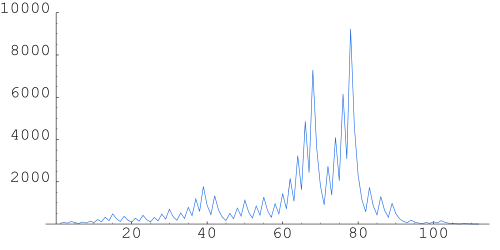 The same plot as the previous one but on log scale, so all y values are shown. The first thick line towards the middle of the plot corresponds to the tip at 27, which reaches a maximum at 9232. -