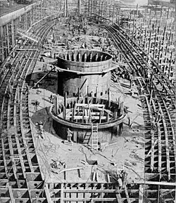 USS Washington (BB-47) was the second ship of the United States Navy named in honor of the 42nd state. Her keel was laid down on 30 June 1919 by the New York Shipbuilding Corporation of Camden, New Jersey. She was launched on 1 September 1921, but on 8 February 1922, two days after the signing of the Washington Naval Treaty, all construction work ceased on the 75.9% completed dreadnought.[40][41]