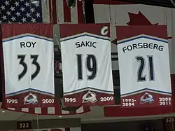 In the 2009 off-season, the Avalanche named Greg Sherman the new general manager and Joe Sacco the new head coach.[106][107] The following month, top scorer Ryan Smyth was traded to the Los Angeles Kings and Joe Sakic, the only team captain the Avalanche had ever known, retired after 21 seasons in the NHL.[108] The Avalanche named Adam Foote as his replacement.[109] Sakic's jersey retirement ceremony took place on October 1, 2009, before the season opener at home against the San Jose Sharks where the Avalanche won 5–2.[110] The Avalanche started the season off strong until the 2010 Winter Olympics break in Vancouver. Three Avalanche team members played in the Winter Olympics – Paul Stastny for the United States, Ruslan Salei for Belarus and Peter Budaj for Slovakia.[111] Following the Winter Olympics, the Avalanche struggled but eventually clinched a playoff spot with 95 points on the season, a 26-point improvement from the previous year's effort, and good enough for eighth place in the Western Conference.[112] The Avalanche fell in the conference quarterfinals to the top-seeded San Jose Sharks in six games.[113]