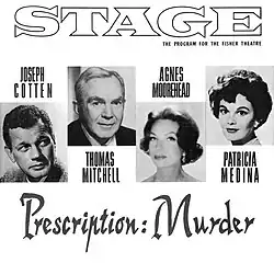 Levinson and Link then adapted the TV drama into the stage play Prescription: Murder. This was first performed at the Curran Theatre in San Francisco on January 2, 1962, with Oscar-winning character actor Thomas Mitchell in the role of Columbo. Mitchell was 70 years old at the time. The stage production starred Joseph Cotten as the murderer and Agnes Moorehead as the victim. Mitchell died of cancer while the play was touring in out-of-town tryouts; Columbo was his last role.