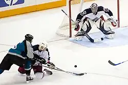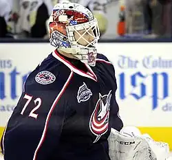 The 2002–03 season started with Columbus putting up a 7–5–1–1 record after the first 14 games.[30] However, as expectations from their fans grew higher, the team came back to mediocrity, finishing last in the Central Division for the third consecutive season with 69 points and missing the playoffs once again.[31] Dave King, who had been the team's head coach since their debut in 2000, was fired mid-season and replaced by general manager Doug MacLean.[32][33] Marc Denis was named starting goaltender; he played a franchise-record 77 games that season and set a league record with 4,511 minutes played in 2002–03. He tied for second all-time for games played in a season by a goaltender, just two shy of the league record held by St. Louis Blues' Grant Fuhr in the 1995–96 season.[34][35]