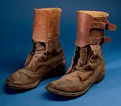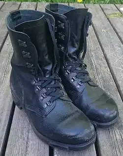 The first true modern combat boots in the US Army, officially titled "Boots, Combat Service", were introduced in conjunction with the M-1943 Uniform Ensemble during World War II.[25][26] They were modified service shoes, with an extended, rough-out or, more commonly, a smooth leather high-top cuff added.[25] The cuff was closed using two buckles, allowing the boots to replace the existing service shoes and leggings worn by most soldiers with a more convenient and practical solution.[25] The boots, and the service shoes from which they were made, had a one piece sole and heel, made from molded synthetic or reclaimed rubber.[25][26][27] These "double buckle" boots were worn through the Korean War as a substitute for the Boots, Russet, Leather Lace Up introduced in 1948. The first type of Combat Boots, or Combat Tropical boots were based on the "buckle boot" design and worn during the early parts of the Vietnam War.[28]