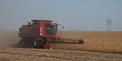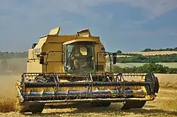 The modern combine harvester, also called a combine, is a machine designed to harvest a variety of cultivated seeds. Combine harvesters are one of the most economically important labour-saving inventions, significantly reducing the fraction of the population engaged in agriculture.[1] Among the crops harvested with a combine are wheat, rice, oats, rye, barley, corn (maize), sorghum, millet, soybeans, flax (linseed), sunflowers and rapeseed (canola). The separated straw (consisting of stems and any remaining leaves with limited nutrients left in it) is then either chopped onto the field and ploughed back in, or laid out in rows, ready to be baled and used for bedding and cattle feed.
