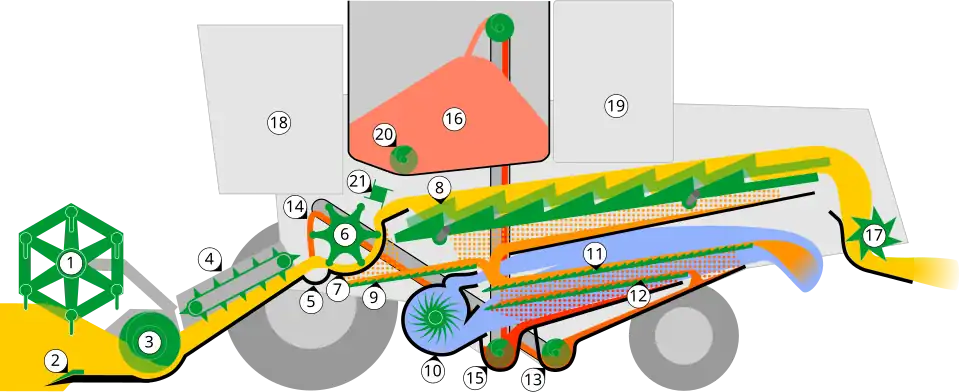 Conventional combine harvester (cut). The yellow stream is the crop, orange is chaff, blue is forced air, and red is the grain.