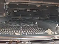 The straw walkers are located above the sieves, and also have holes in them. Any grain remaining attached to the straw is shaken off and falls onto the top sieve.