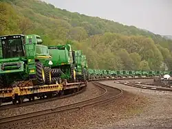 John Deere combine harvesters being transported by railway on flat cars in Tyrone, Pennsylvania, in the United States