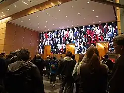 The Comcast Experience is a 25-foot (7.6 m) tall, 83-foot (25 m) wide, 2,000-square-foot (190 m2) high-definition LED screen situated on a wall in the winter garden. The screen is composed of 7.8 million, 4.66mm pitch pixels housed in 6,771 LED modules of the type used in the Barco NX-4 panel.[44][45] The installation, designed and produced by Niles Creative Group, premiered on June 6, 2008, and runs eighteen hours each day. The content of the video includes panoramic views of Philadelphia historic sites, images of space, dancers, acrobats and actors moving around a background designed to mimic wood paneling of the walls of the lobby. Another part of the installation displays images of cranes and machinery forming the design of a clock that tells the correct time of day.[47]