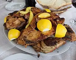 In Central Europe, it is a traditional part of a Christmas Eve dinner. Hungarian fisherman's soup, a specially prepared fish soup of carp alone or mixed with other freshwater fish, is part of the traditional meal for Christmas Eve in Hungary along with stuffed cabbage and poppy seed roll and walnut roll. A traditional Czech Christmas Eve dinner is a thick soup of carp's head and offal, fried carp meat (sometimes the meat is skinned and baked instead) with potato salad or boiled carp in black sauce.[66] A Slovak Christmas Eve dinner is quite similar, with soup varying according to the region and fried carp as the main dish. Also in Austria, parts of Germany, and Poland, a fried carp is one of the traditional dishes on Christmas Eve.[67] Carp are mixed with other common fish to make gefilte fish, popular in Jewish cuisine.[68].