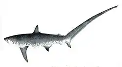 The common thresher (Alopias vulpinus), also known as Atlantic thresher, is the largest species of thresher shark, family Alopiidae, reaching some 6 m (20 ft) in length. About half of its length consists of the elongated upper lobe of its caudal fin. With a streamlined body, short pointed snout, and modestly sized eyes, the common thresher resembles (and has often been confused with) the pelagic thresher (A. pelagicus). It can be distinguished from the latter species by the white of its belly extending in a band over the bases of its pectoral fins. The common thresher is distributed worldwide in tropical and temperate waters, though it prefers cooler temperatures. It can be found both close to shore and in the open ocean, from the surface to a depth of 550 m (1,800 ft). It is seasonally migratory and spends summers at lower latitudes.