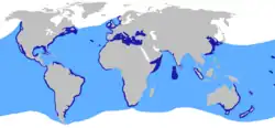 | Confirmed (dark blue) and suspected (light blue) range of the common thresher[3] | |