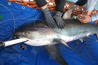 In the United States, a drift gillnet fishery for the common thresher developed in southern California in 1977, beginning with 10 vessels experimenting with a larger-sized mesh. Within two years, the fleet had increased to 40 vessels, and the fishery peaked in 1982 when 228 vessels landed 1,091 metric tons. The common thresher population rapidly collapsed from overfishing, with landings decreasing to less than 300 metric tons a year by the late 1980s and larger size classes disappearing from the population.[15][43] Common threshers are still taken commercially in the United States, with about 85% coming from the Pacific and 15% from the Atlantic. The largest catches remain from the California-Oregon gillnet fishery, which had shifted its focus to the more valuable swordfish (Xiphias gladius), but still takes threshers as bycatch. Small numbers of Pacific threshers are also taken by harpoons, small-mesh driftnets, and longlines. In the Atlantic, threshers are primarily taken on longlines meant for swordfish and tuna.[44][45]