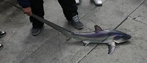 The specific epithet vulpinus is derived from the Latin vulpes meaning "fox", and in some older literature the species name was given incorrectly as Alopias vulpes.[6] "Fox shark" is the earliest known English name for this species and is rooted in classical antiquity, from a belief that it was especially cunning. In the mid-19th century, the name "fox" was mostly superseded by "thresher", referencing the shark's flail-like use of its tail. This species is often known simply as thresher shark or thresher; Henry Bigelow and William Schroeder introduced the name "common thresher" in 1945 to differentiate it from the bigeye thresher (A. superciliosus).[7] It is also known by many other common names, including Atlantic thresher, grayfish, green thresher, long-tailed shark, sea ape, sea fox, slasher, swiveltail, thintail thresher, thrasher shark, and whiptail shark.[3][8]