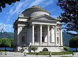 Its prime location on the southwestern branch of Lake Como and its proximity to the Alps has made Como a popular destination for tourists. The city boasts a rich collection of art, religious sites, verdant gardens, museums, theatres, public parks, and opulent palaces, including the iconic Duomo, seat of the Diocese of Como; the Basilica of Sant'Abbondio; Villa Olmo; the public gardens with the Tempio Voltiano; the Teatro Sociale; the Broletto, the city's medieval town hall; and the 20th-century Casa del Fascio, a landmark of modernist architecture.[7]