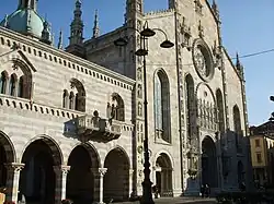 The territory of the Commune extended beyond the town of Como itself, encompassing the entire diocese, which included most of present-day Province of Como, modern-day Canton of Ticino, Valtellina, Valchiavenna, and Colico.[20][21] Thanks to its strategic position on Lake Como and the important Road of Queen Theudelind, which linked the Italian Peninsula with Germany: the heart of the Holy Roman Empire, Como quickly became a wealthy and powerful town.[22]