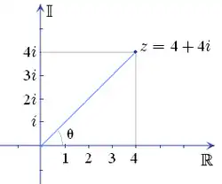 for example: z = 4 + 5i, where x and y are real numbers, and i is the imaginary unit. In this customary notation the complex number z corresponds to the point (x, y) in the Cartesian plane; the point (x, y) can also be represented in polar coordinates with: