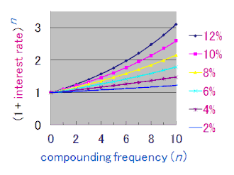 - n is the compounding frequency (1: annually, 12: monthly, 52: weekly, 365: daily)[10]