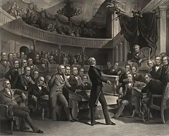Henry Clay takes the floor of the Old Senate Chamber; Vice President Millard Fillmore presides as John C. Calhoun (to the right of Fillmore's chair) and Daniel Webster (seated to the left of Clay) look on.