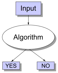 Decision problems are one of the central objects of study in computational complexity theory. A decision problem is a type of computational problem where the answer is either yes or no (alternatively, 1 or 0). A decision problem can be viewed as a formal language, where the members of the language are instances whose output is yes, and the non-members are those instances whose output is no. The objective is to decide, with the aid of an algorithm, whether a given input string is a member of the formal language under consideration. If the algorithm deciding this problem returns the answer yes, the algorithm is said to accept the input string, otherwise it is said to reject the input.