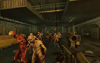 A screenshot from the videogameKilling Floor, built in Unreal Engine 2. Personal computers and console video games took a great graphical leap forward in the 2000s, becoming able to display graphics in real-time computing that had previously only been possible pre-rendered and/or on business-level hardware.